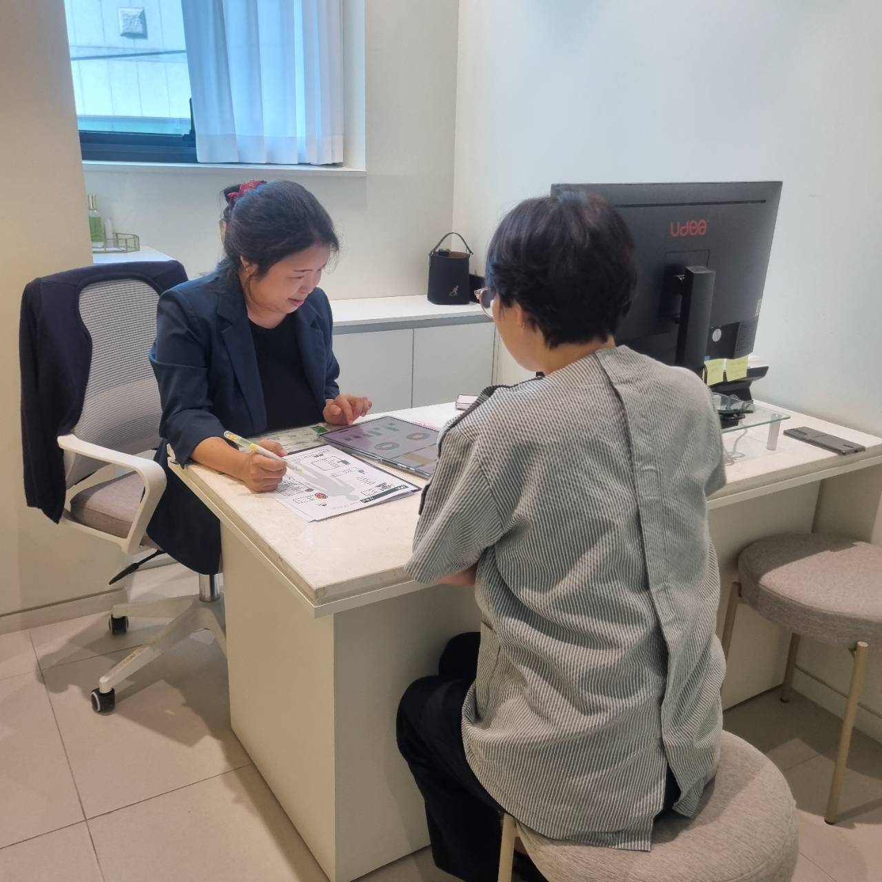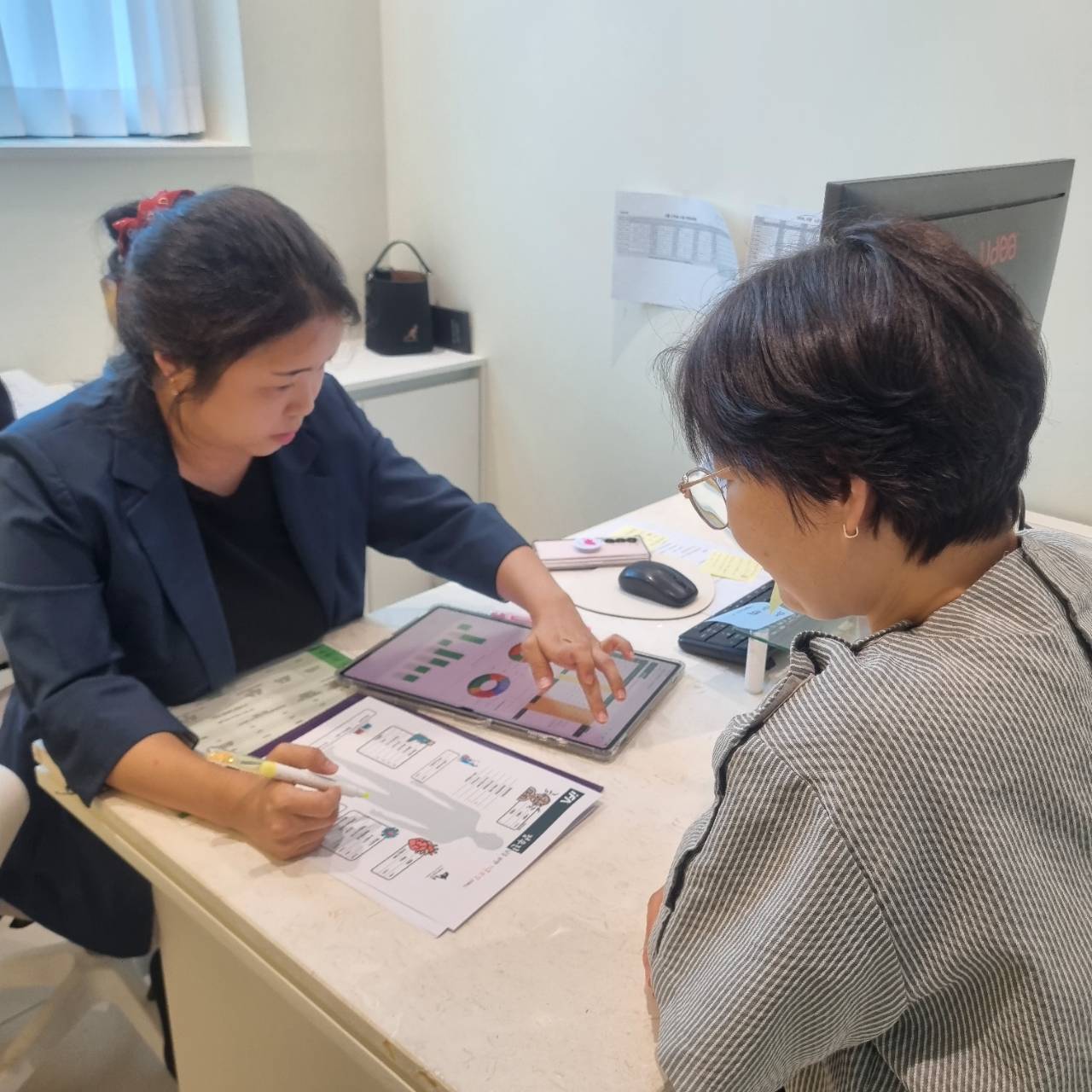 상담사는 환자분의 보험 증권을 검토해 보장 내용과 청구 절차를 안내하며,
